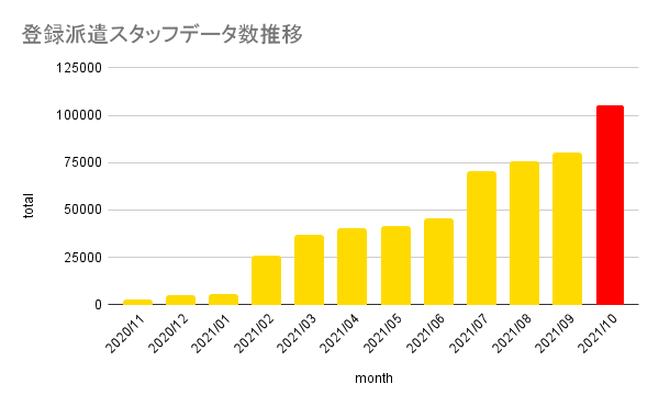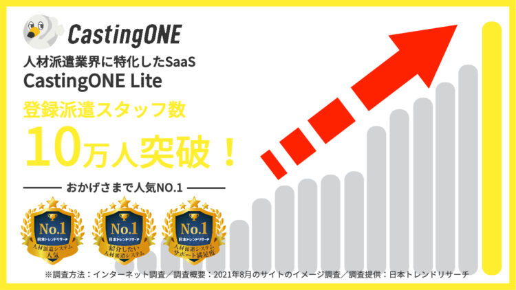人材派遣業界に特化したSaaS「CastingONE Lite」のデータベースに登録された派遣スタッフ数が、2020年11月から2021年10月の1年間で100,000人を突破いたしました。